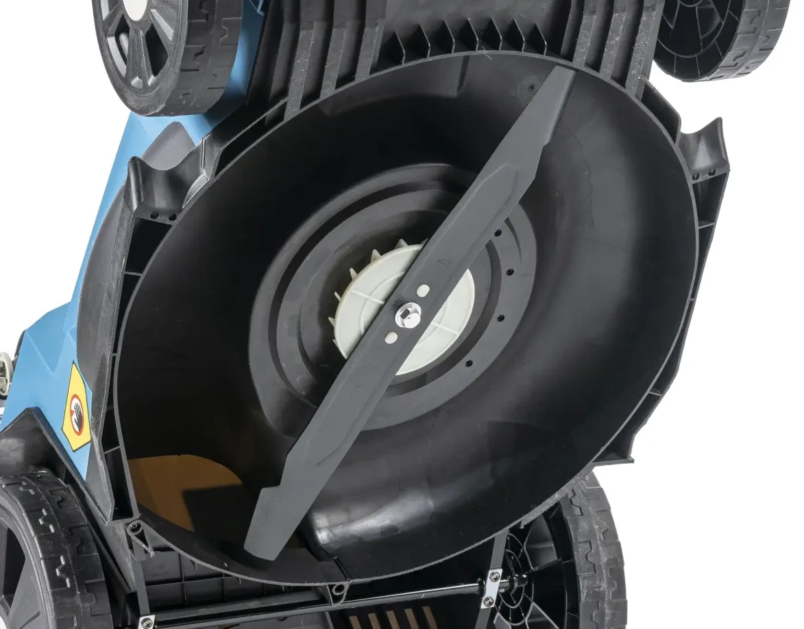 Kosiarka napędzana jest wytrzymałym silnikiem bezszczotkowym. Taka konstrukcja pozwala na bardzo cichą pracę. Dzięki szerokości koszenia 430 mm idealnie sprawdzi się w średnich i większych ogródkach. Zwarta i lekka konstrukcja oraz duże koła ułatwiają manewrowanie urządzeniem. Wysokość koszenia jest ustawiana centralnie w sześciu pozycjach (25-75mm). Kosiarka posiada funkcję mulczowania/mielenia trawy, dzięki czemu ograniczamy objętość urobku. Składana rękojeść oraz kosz z siatką ułatwiają przechowywanie i transportowanie. Zwiększona pojemność kosza (50l) zapewnia dłuższą pracę bez konieczności opróżniania kosza.