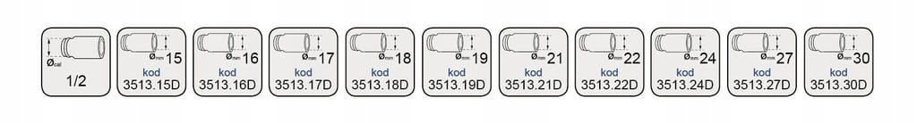 - Nasadki udarowe długie 1/2" sprzedajemy pojedynczo, dostępne rozmiary to: 15, 16, 17, 18, 19, 21, 22, 24, 27, 30 mm