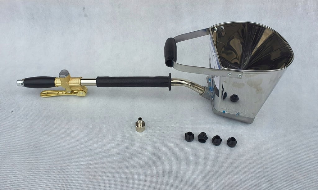 - Urządzenie wykonane z aluminium i stali nierdzewnej, posiada gumowane rękojeści oraz długi przycisk spustowy ułatwiający pracę.