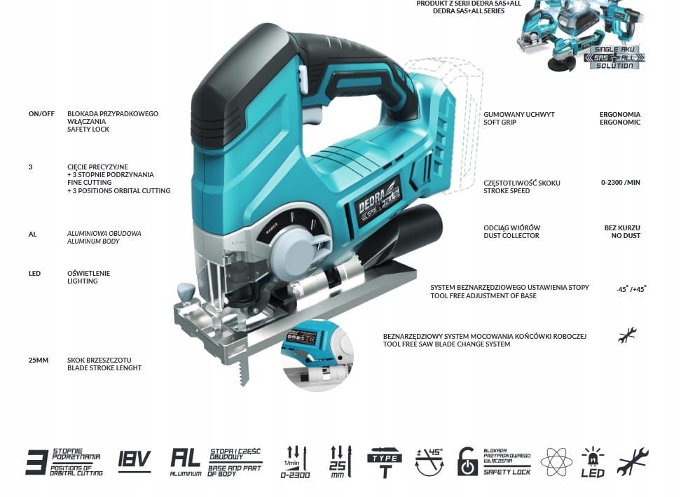 - 1 x Akumulatorowa wyrzynarka DEDRA SAS+ALL DED7060 18V