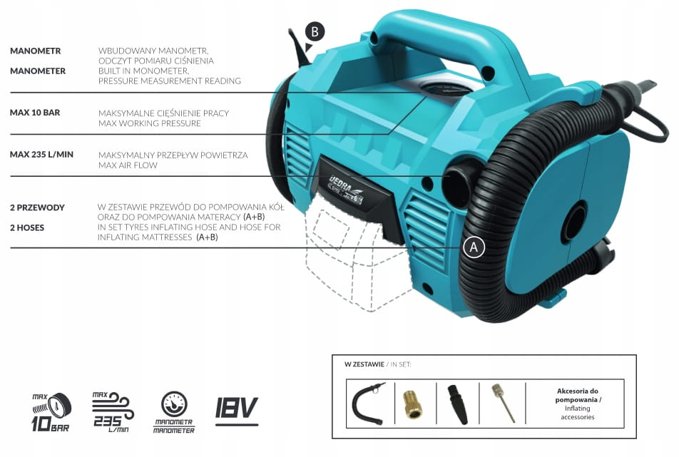 W skład kompresora wchodzi zestaw czterech końcówek do pompowania oraz dodtkowy przewód przy użyciu którego z łatwością nie tylko napompujemy ale i wypompujemy powietrze np. z materacy czy basenów.