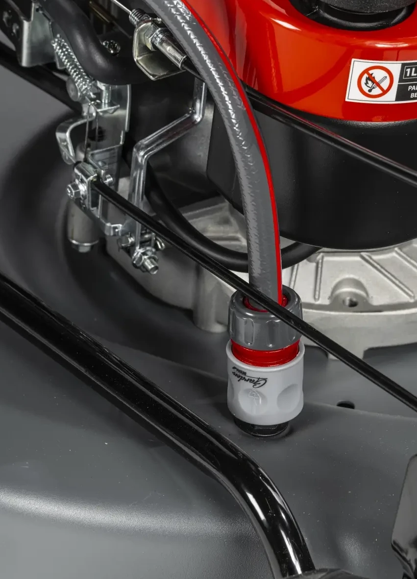 Dodatkowo kosiarka posiada funkcję mycia obudowy - do korpusu kosiarki możemy podłączyć wąż ogrodowy z szybkozłączem żeńskim – męski króciec jest na obudowie kosiarki. Przy włączonym silniku odkręcamy kran i woda podawana jest przez wąż na wewnętrzną część obudowy, a ostrze swoją siłą obrotową rozprowadza wodę i „myje” kosiarkę od spodu – tam gdzie najwięcej zaschniętej zlepionej trawy.