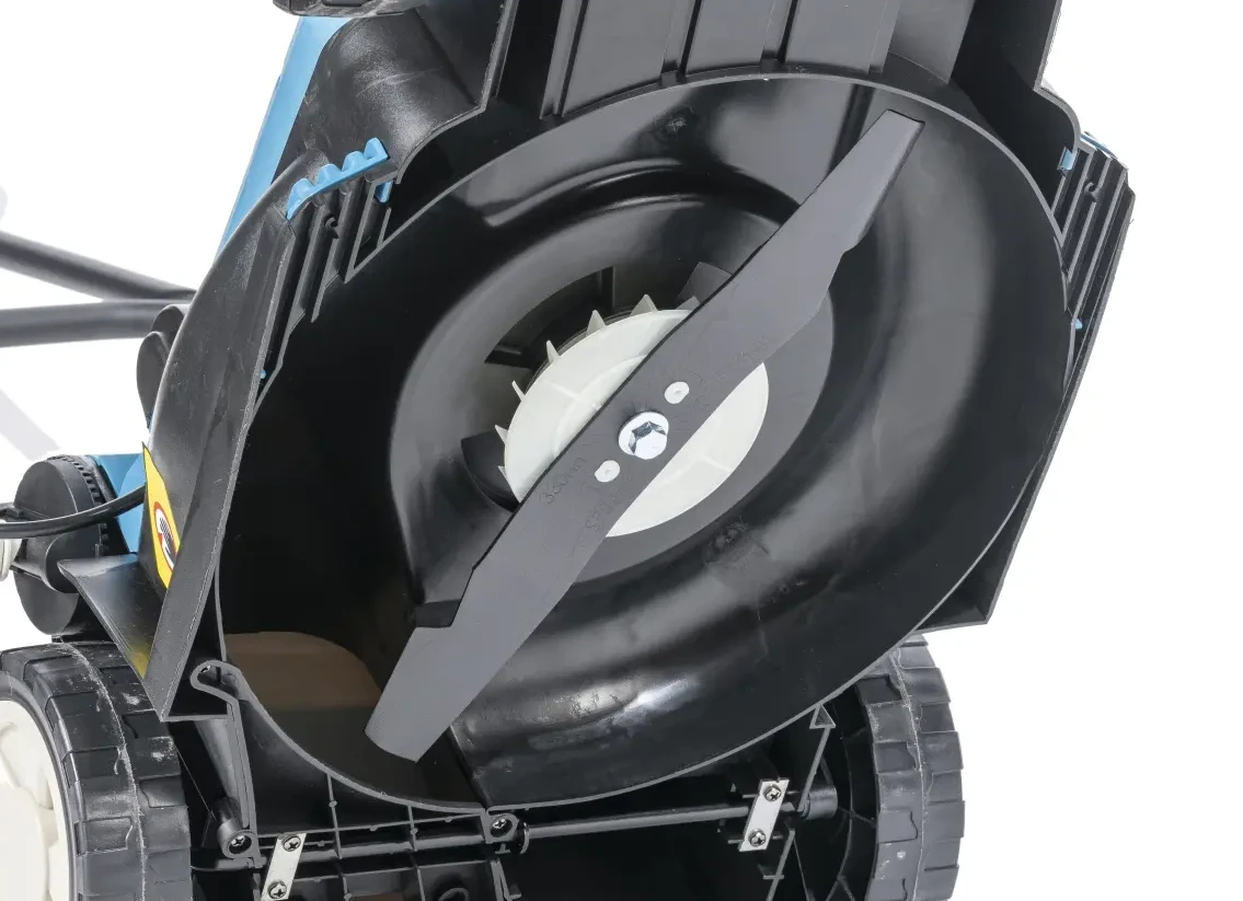 Kosiarka napędzana jest wytrzymałym silnikiem bezszczotkowym. Taka konstrukcja pozwala na bardzo cichą pracę. Dzięki szerokości koszenia 330 mm idealnie sprawdzi się w małych ogródkach. Zwarta i lekka konstrukcja oraz duże koła ułatwiają manewrowanie urządzeniem. Wysokość koszenia jest ustawiana centralnie w pięciu pozycjach (25-75mm). Kosiarka posiada funkcję mulczowania/mielenia trawy, dzięki czemu ograniczamy objętość urobku. Składana rękojeść oraz kosz z siatką ułatwiają przechowywanie i transportowanie.