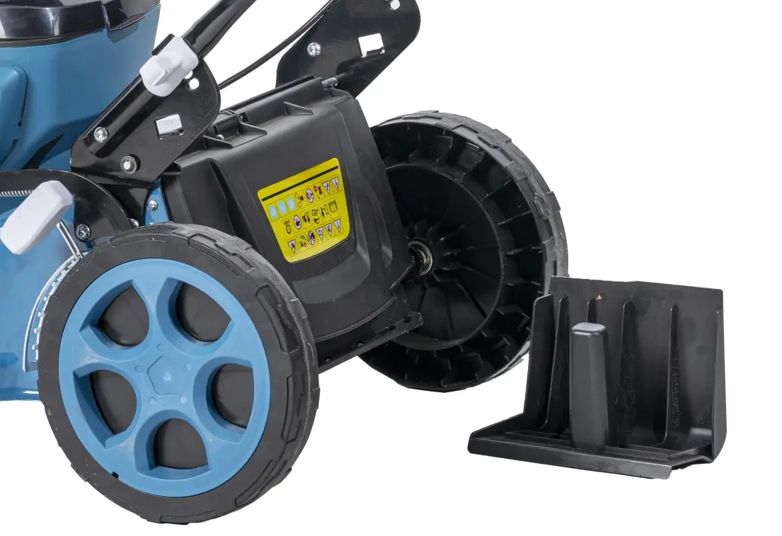 Kosiarka wyposażona jest w slot na cztery akumulatory, co pozwala na długotrwałe koszenie bez potrzeby przerw na ładowanie. System automatycznego przełączania między parami akumulatorów umożliwia ciągłą pracę – gdy jedna para się rozładuje, urządzenie automatycznie przełącza się na kolejną. Takie rozwiązanie pozwala na nieprzerwaną pracę przez dłuższy czas, eliminując konieczność ręcznego przełączania akumulatorów czy czekania na ich naładowanie, co zdecydowanie podnosi efektywność i komfort użytkowania.
