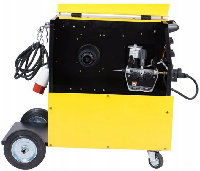 - Spawarka wyposażona jest w profesjonalny 4-rolkowy podajnik drutu z gniazdem "euro złącze" co pozwala na podłączenie różnych typów uchwytów spawalniczych oraz wyjście na podgrzewacz gazu.
