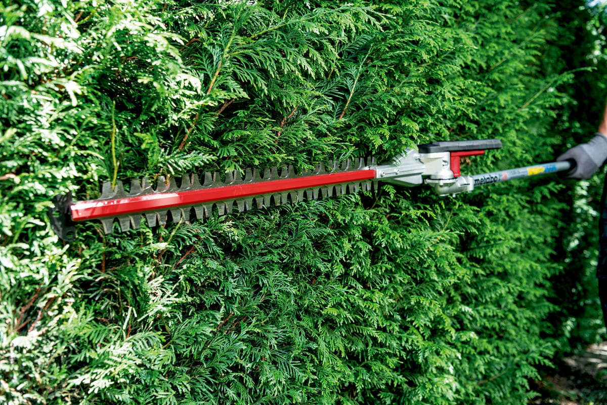 - Przycinanie wysokich żywopłotów i krzewów za pomocą przystawki - nożyce do żywopłotu z systemu wielofunkcyjnego Metabo, uniwersalne rozwiązanie do wielu prac ogrodowych