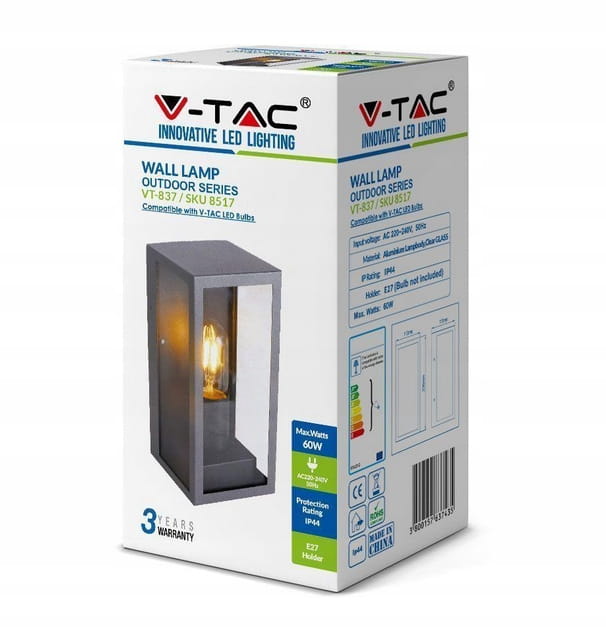 Oprawa Ścienna Elewacyjna LOFT V-TAC 1xE27 IP44 Czarny MAT VT-837 3 Lata Gwarancji