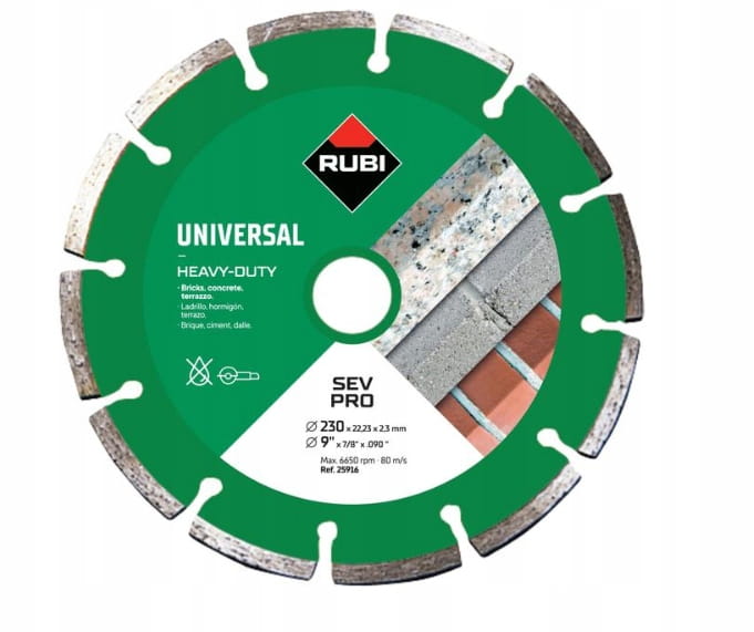 - Tarcza diamentowa RUBI serii SEV jest tarczą zalecaną do cięcia na sucho ogólnych materiałów budowlanych, takich jak cegły, beton, płyty terrazzo, itp.