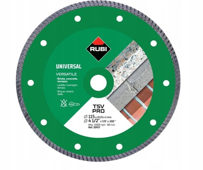 - Tarcza diamentowa RUBI TSV o obrzeżu typu TURBO jest przeznaczona do cięcia na sucho materiałów budowlanych, takich jak cegła, beton i lastryko.