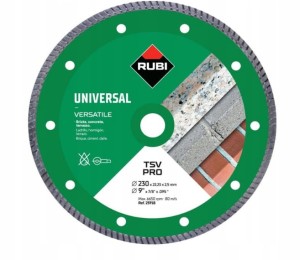 - Tarcza diamentowa RUBI TSV o obrzeżu typu TURBO jest przeznaczona do cięcia na sucho materiałów budowlanych, takich jak cegła, beton i lastryko.