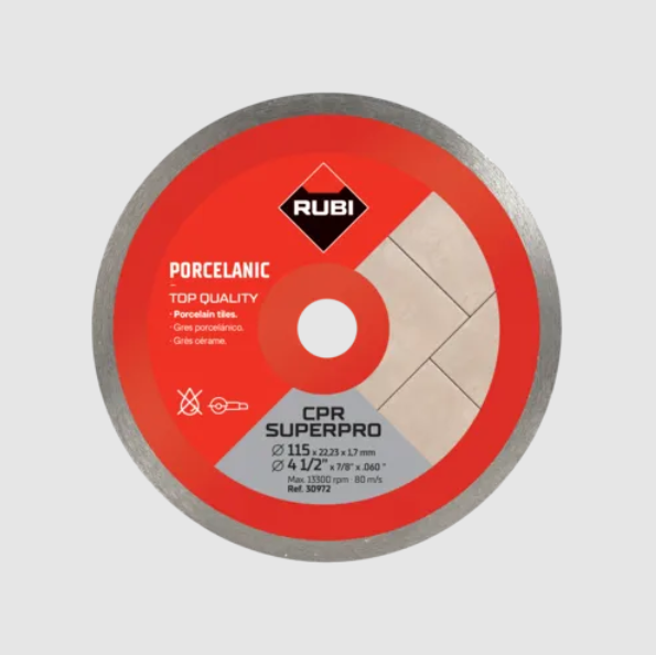 Obecnie największym problemem stojącym przed profesjonalnymi wykonawcami jest konieczność cięcia płytek gresowych. W RUBI znamy styl pracy wykonawców w każdym kraju na świecie, znamy potrzeby zawodowe profesjonalnych glazurników oraz rodzaje materiałów używanych na inwestycjach i przy remontach. Dzięki temu RUBI może wykorzystać wiedzę i doświadczenie do produkcji narzędzi wysokiej jakości. Wysokie oczekiwania stawiane przed nami przez klientów i rynek pomogły nam wykorzystać tę wiedzę w projektowaniu narzędzi i produktów do cięcia i układania płytek ceramicznych w możliwie najdokładniejszy sposób. W rezultacie powyższych wysiłków stworzono tarczę diamentową RUBI CPR, która idealnie nadaje się do cięć na sucho szczególnie bardzo twardych materiałów o grubości mniejszej niż 25 mm. Tarcza RUBI CPR łączy w sobie spoiwo wykonane z różnych stopów metali oraz ziarno diamentowe o bardzo wysokiej jakości. Dzięki temu możliwe jest cięcie na sucho przy uzyskaniu jakości cięcia satysfakcjonującej glazurników na całym świecie. Dzięki technice spawania laserowego udało się uzyskać połączenie pomiędzy obrzeżem diamentowym oraz metalowym dyskiem tarczy ciągłej RUBI - CPR gwarantujące jakość cięcia i bezpieczeństwo użytkownika. Tarcze diamentowe RUBI oferowane są w dwóch klasach jakości: PRO oraz SUPERPRO. Tarcze jakości PRO zapewniają użytkownikom najlepszy stosunek jakości do ceny. Tarcze jakości SUPERPRO stanowią najlepszy wybór podczas najbardziej wymagających prac. Tarcze o grubości dysku mniejszej niż 2 mm nie są zalecane do cięć ukośnych. Marka RUBI jest znana z najlepszej żywotności i jakości swoich narzędzi. Od ponad 65 lat RUBI produkuje narzędzia najwyższej jakości i wytrzymałości, by uzyskać najlepszą wydajność w najtrudniejszych warunkach roboczych i dopasować się do potrzeb zgłaszanych na każdym z rynków.